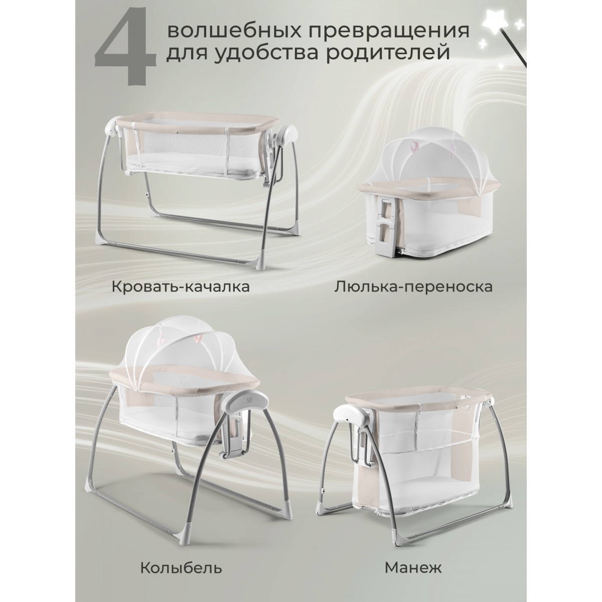 Богатая комплектация: в комплект входят: пульт ДУ, адаптер, москитная сетка, подвесные игрушки, мягкий матрасик из хлопка, электронный блок управления.