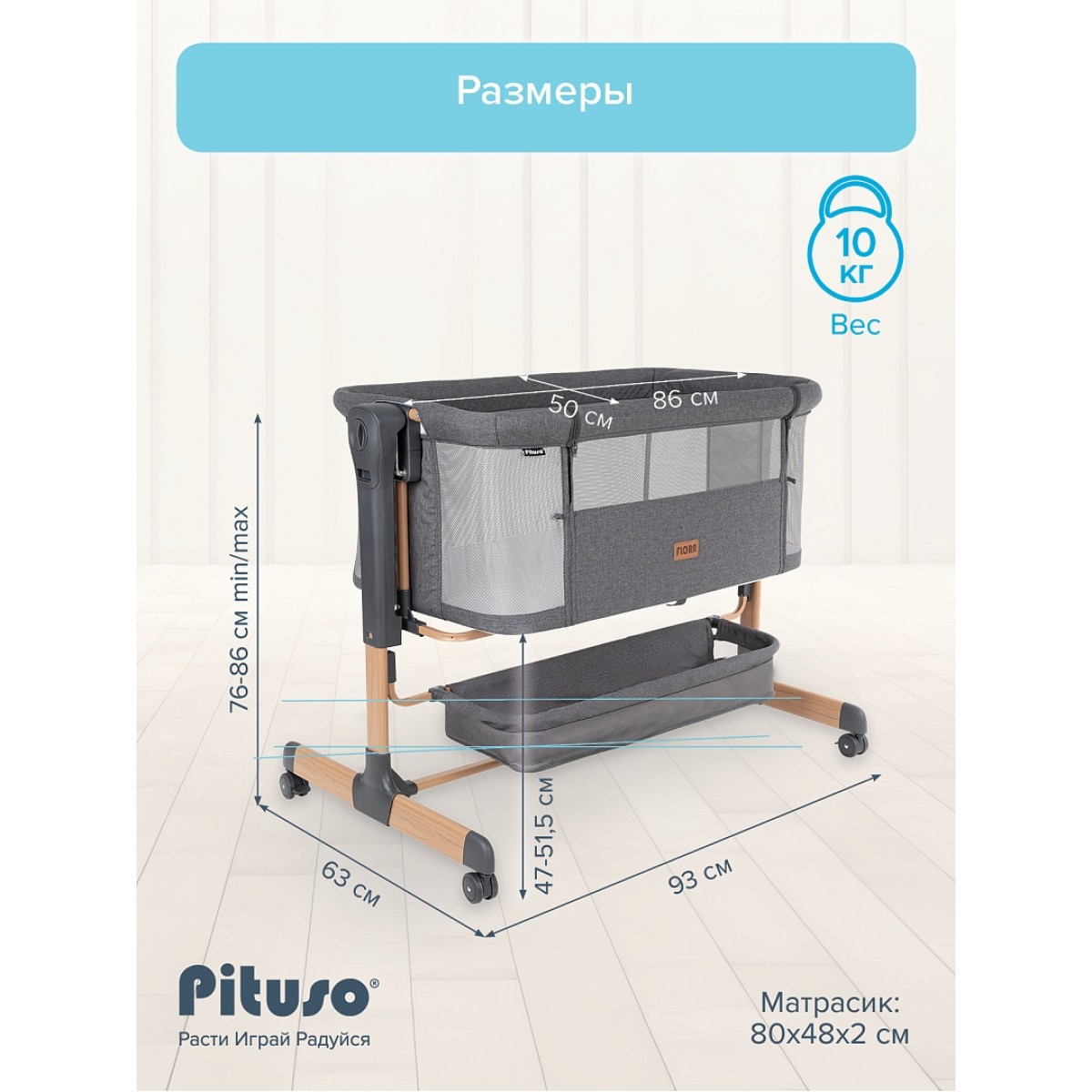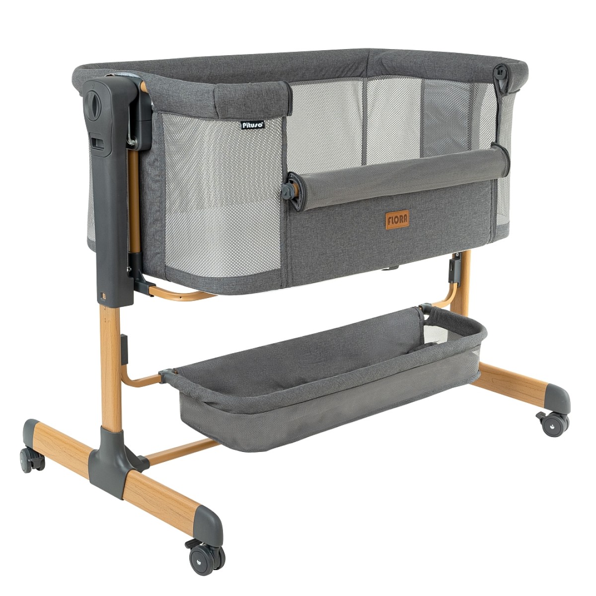 Приставная колыбель Pituso Flora имеет безопасную систему крепления к кровати родителей и позволяет вам спать рядом с малышом. Уникальная связь между малышом и родителями будет еще сильнее, а ночи – спокойнее! С колыбелью можно не беспокоиться о самочувствии младенца по ночам, ведь теперь вы сможете покормить и успокоить малыша, когда бы он ни проснулся. Также мама может приподнять изголовье ложа, что улучшит дыхание малыша во время простудных заболеваний и снизит риск срыгивания после кормления. Регулируемая высота опор дает возможность создать наклон. Колыбель оснащена специальной системой крепления, благодаря которой фиксировать ее к кровати родителей очень просто (крепится к кровати родителей с помощью ремней). Боковой бортик опускается для присоединения к кровати родителей и поднимается обратно. Прочная алюминиевая рама имеет 6 уровней регулировки высоты и усилена дополнительной защитой против случайного сложения. А кнопки с обеих сторон колыбели предотвращают случайную смену положения высоты. Колыбель можно использовать как самостоятельную детскую кроватку. Сетка по всему периметру колыбели позволяет родителям присматривать за ребенком.