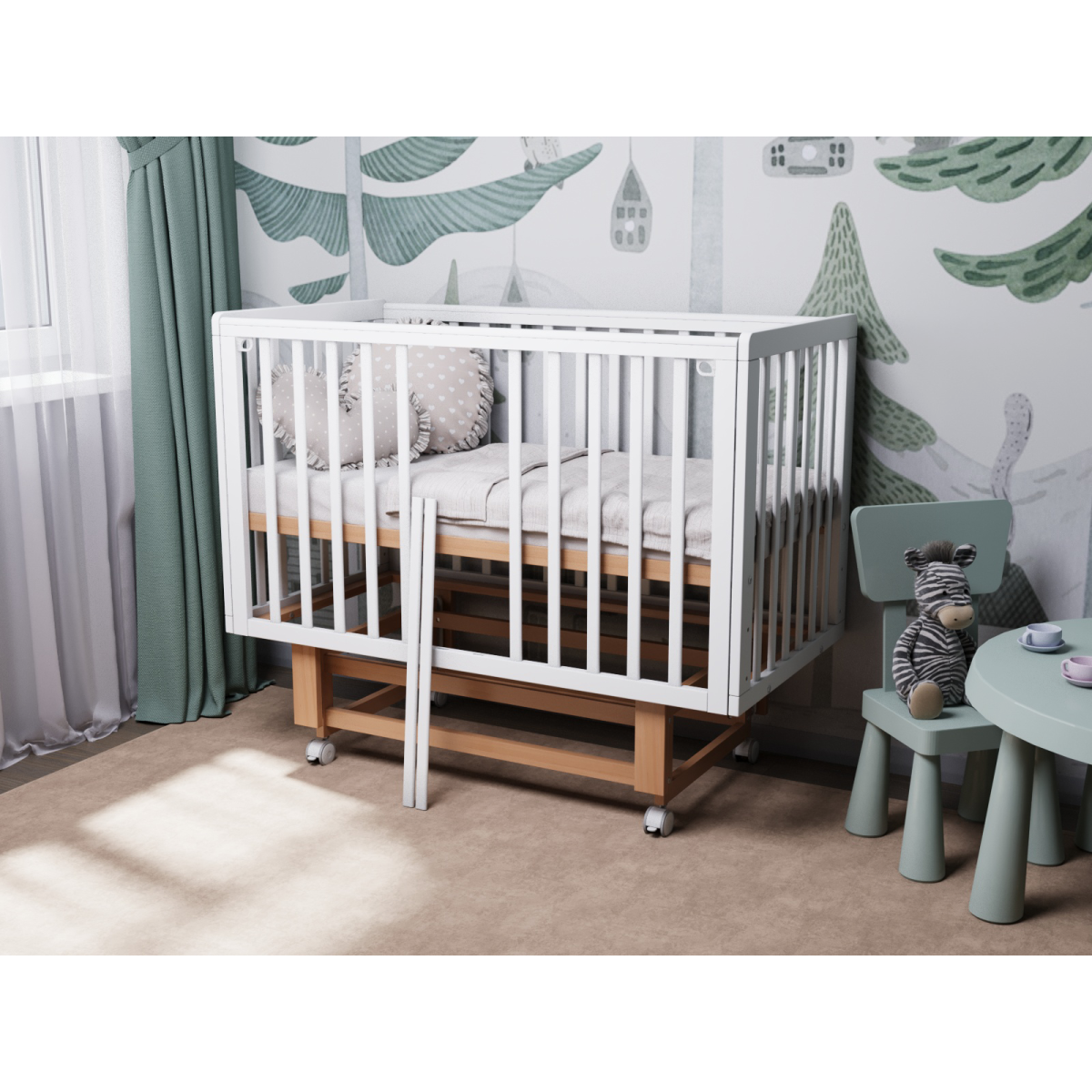 -Верхние планки с прозрачными силиконовыми накладками для защиты поверхности кроватки и зубок малыша.