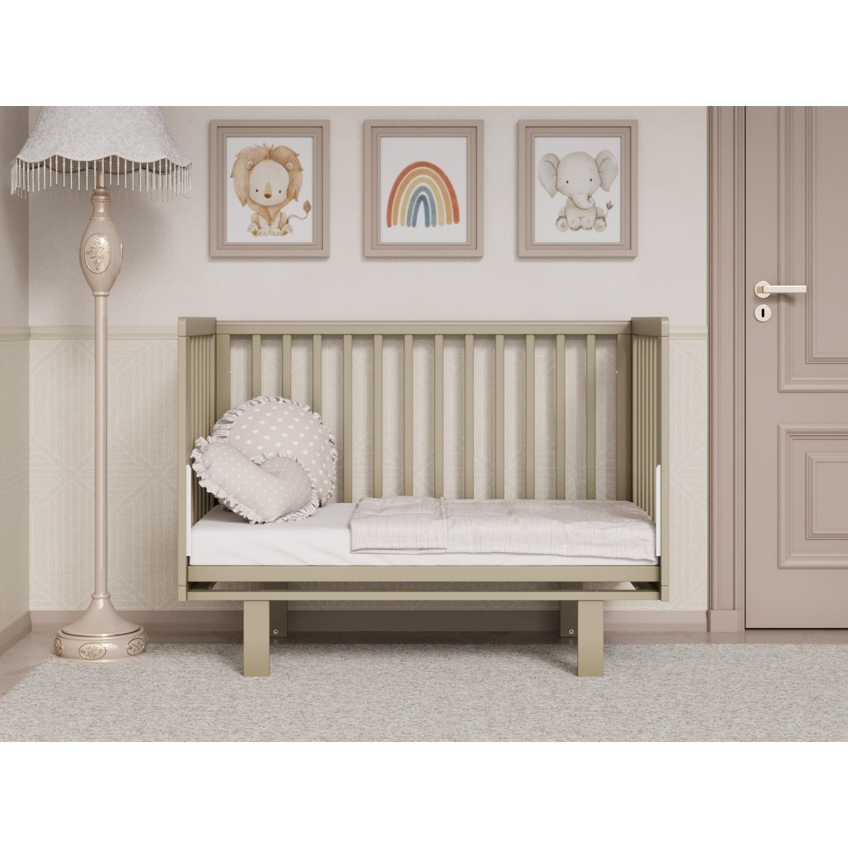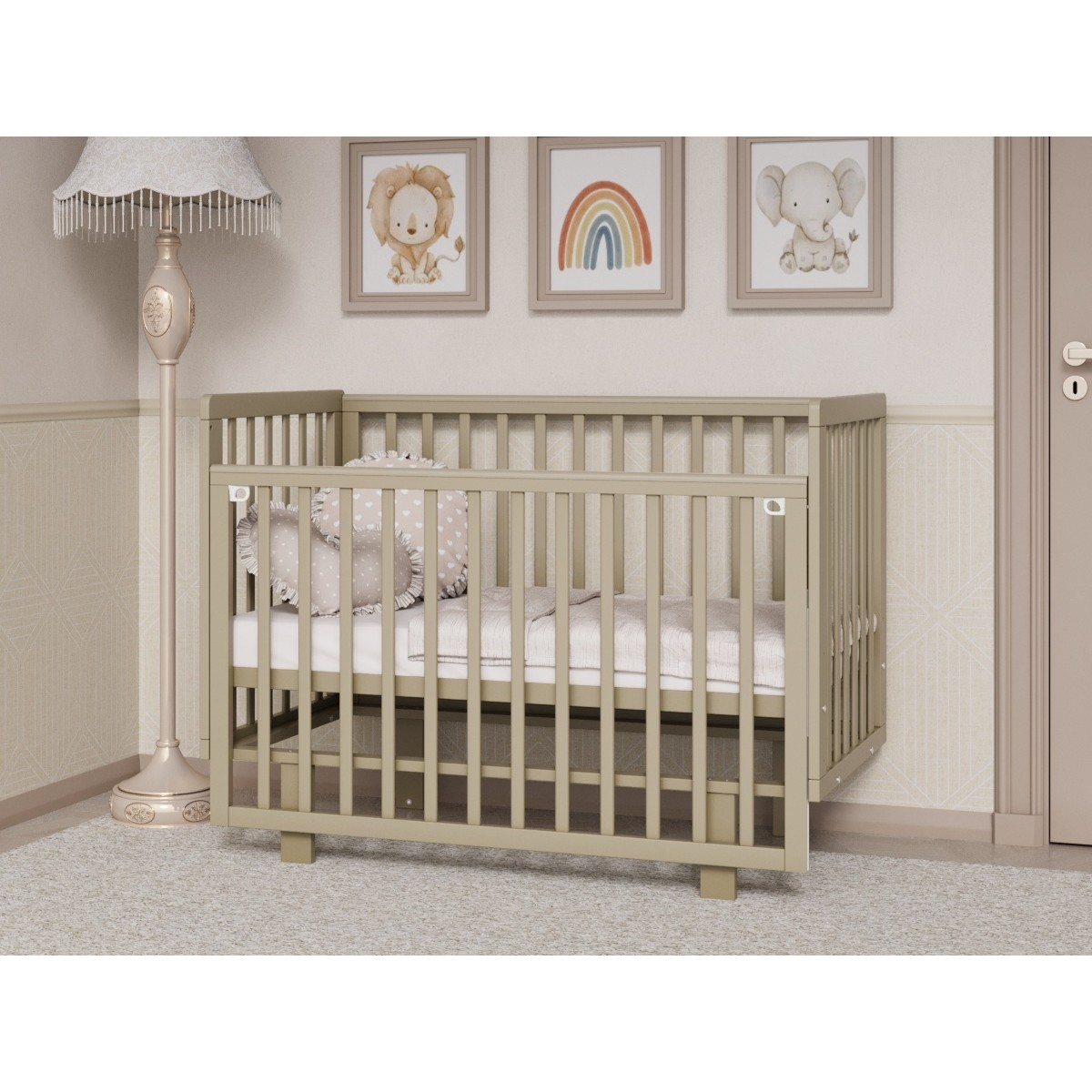 -Верхние планки с прозрачными силиконовыми накладками для защиты поверхности кроватки и зубок малыша.