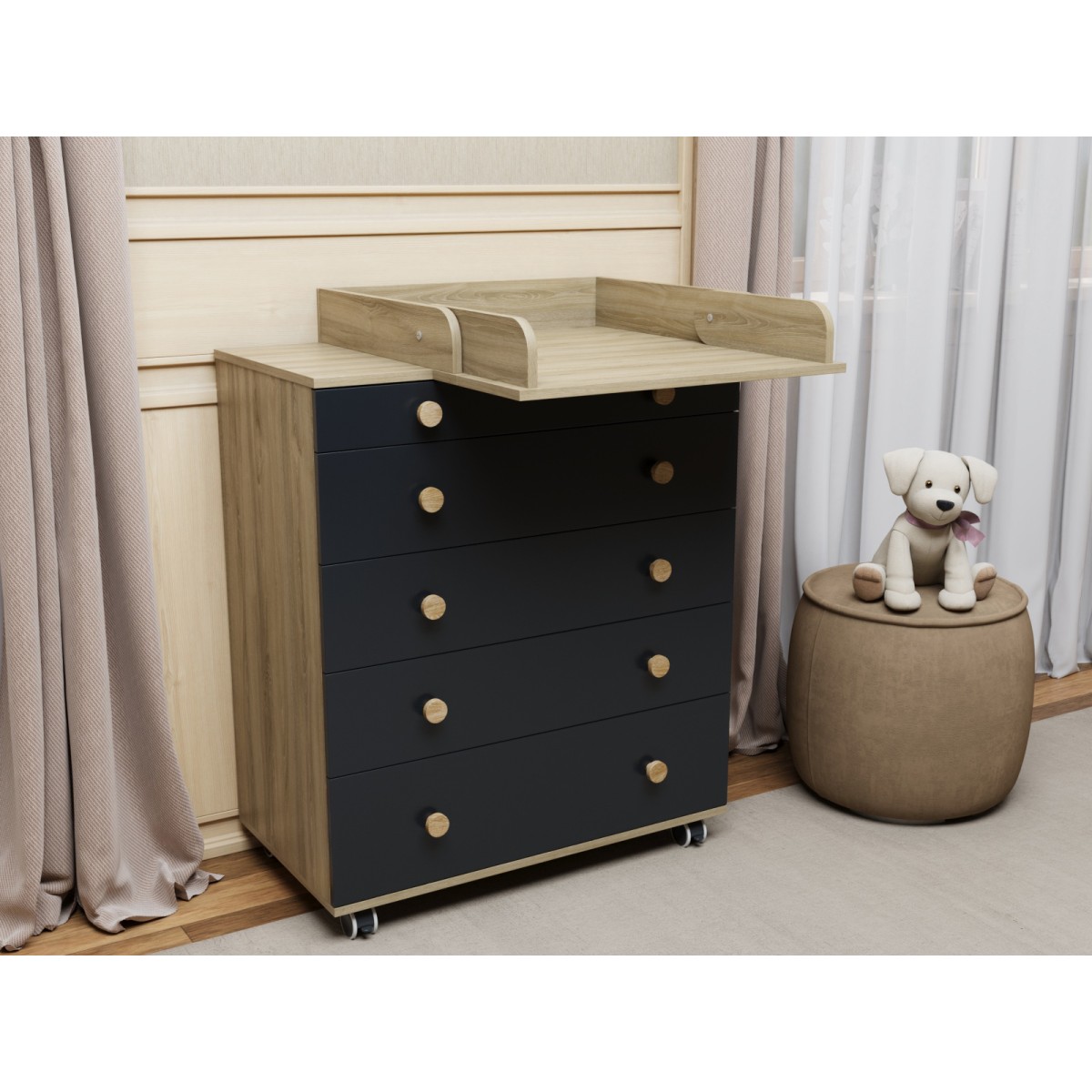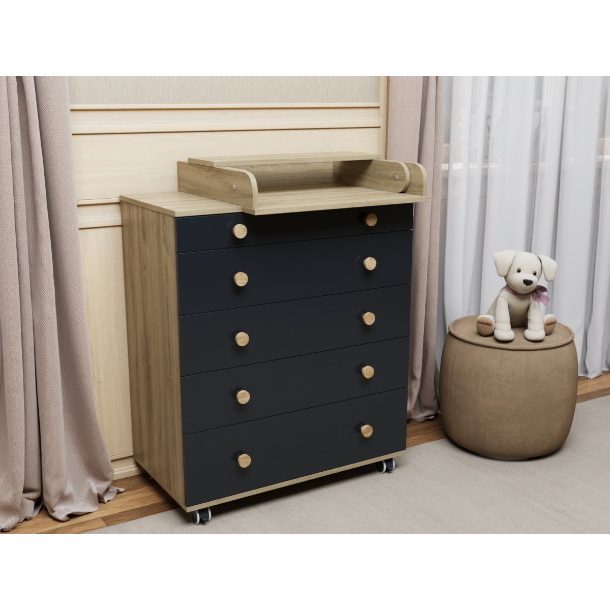 Комод пеленальный Lunna Teddy Lite с колесами на 5 ящиков + пеленальная зона цвет: дуб/графит