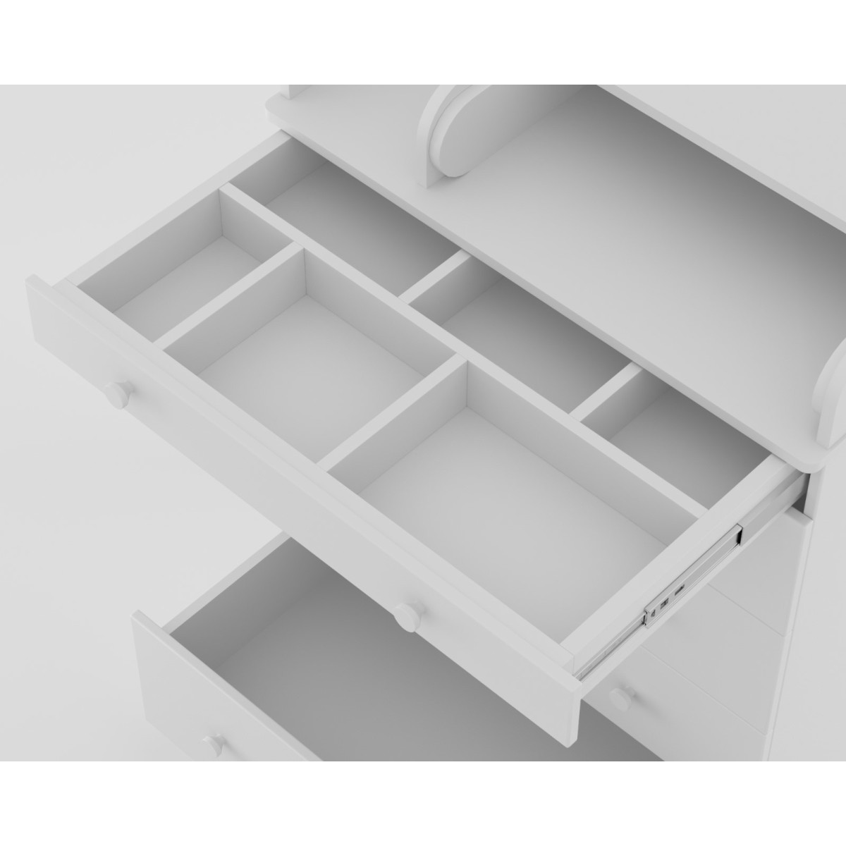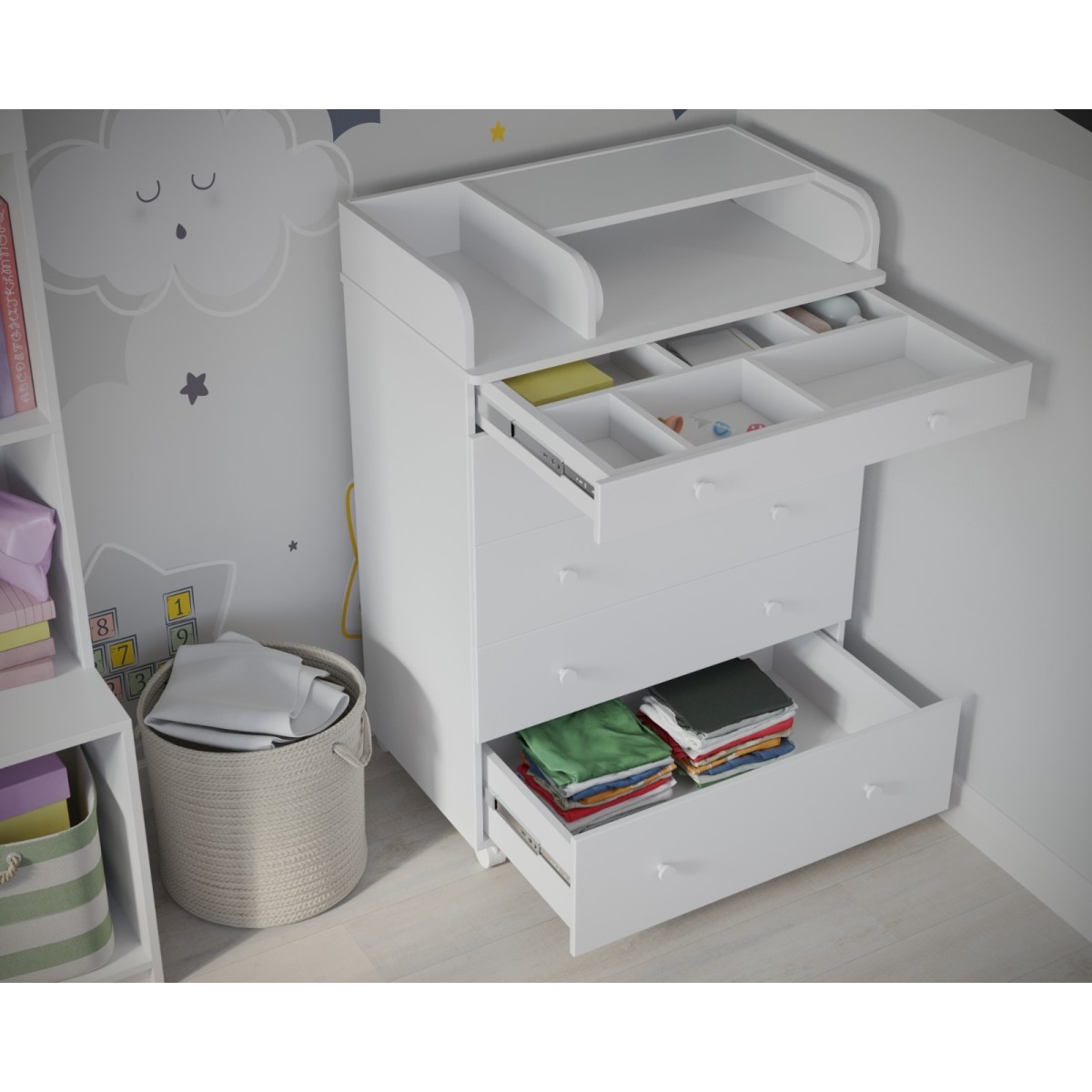 На комоде расположен складной пеленальный столик, который в сложенном виде может использоваться как дополнительные полочки. Рядом с пеленальным столиком есть удобное место для аптечки и гигиенических средств ребенка. В разложенном виде пеленальный столик очень удобен, имеет высокие бортики безопасности. Пеленальный столик позволит маме осуществлять все необходимые гигиенические процедуры для ребенка, переодевание, пеленание, на удобной для нее высоте.