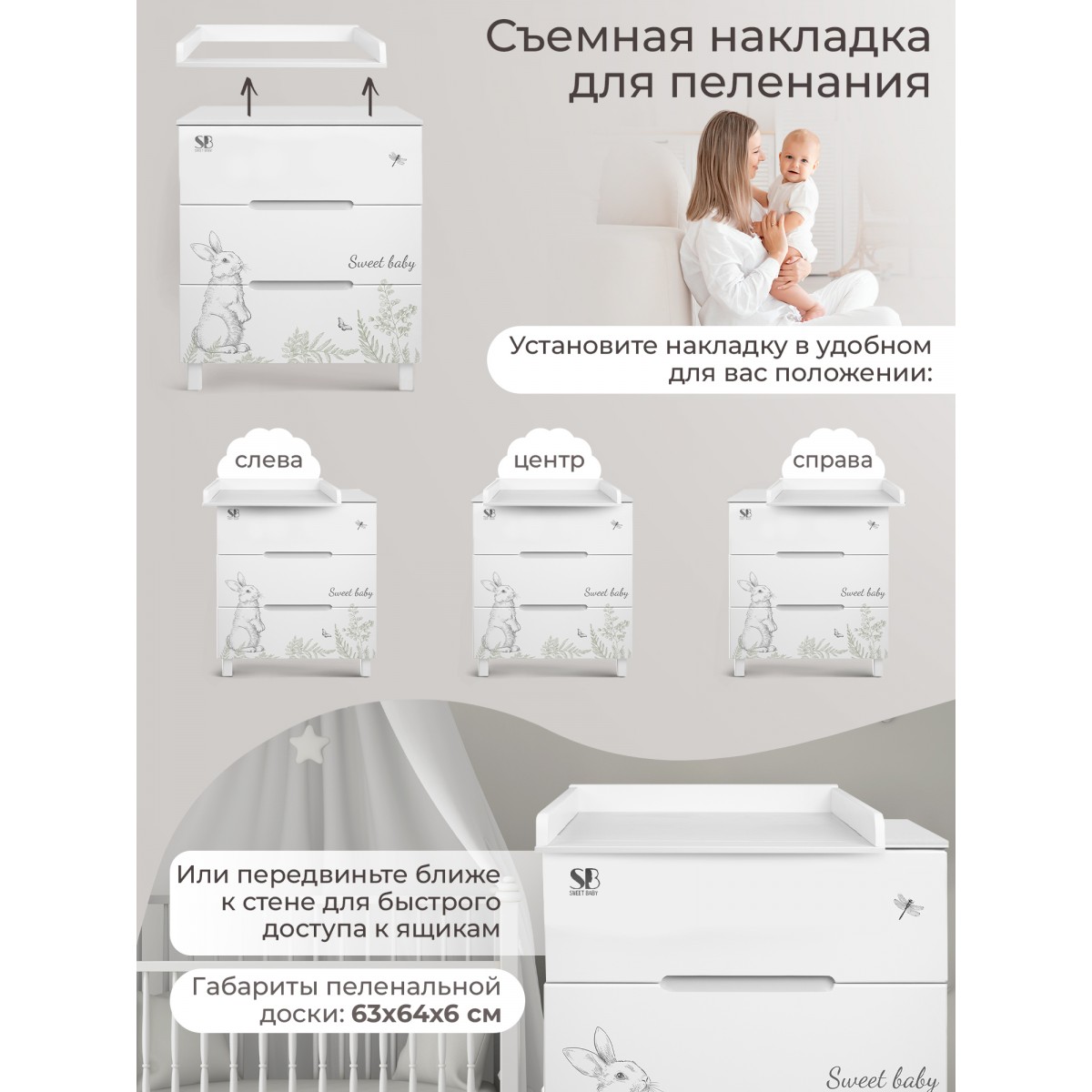 У комода есть съемный пеленальный столик, который делает процесс пеленания удобным и безопасным как для вас, так и для вашего новорожденного ребенка.