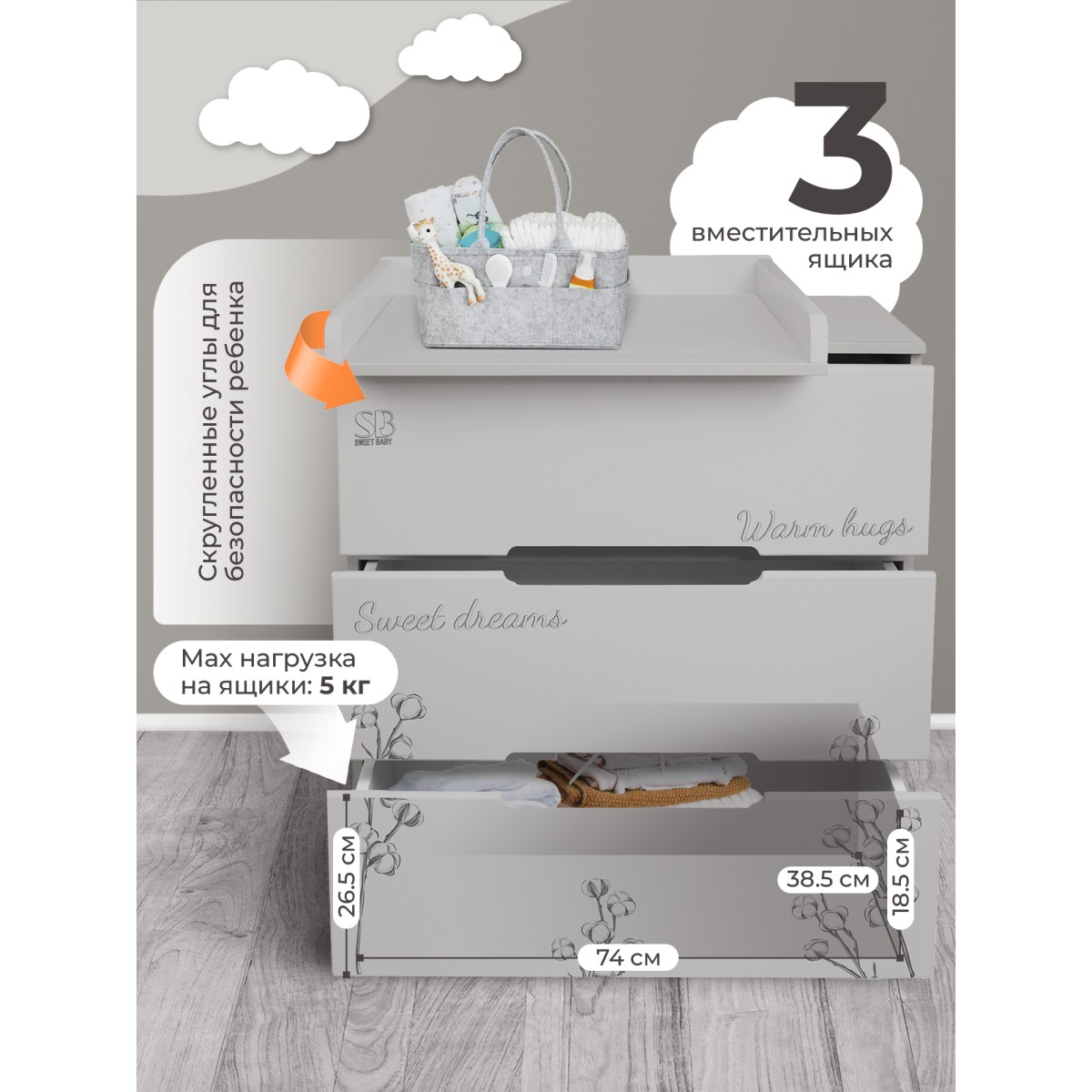 У комода 3 вместительных ящика и ручки интегрированные. Ящики большие для удобного хранения одежды и вещей вашего ребенка.