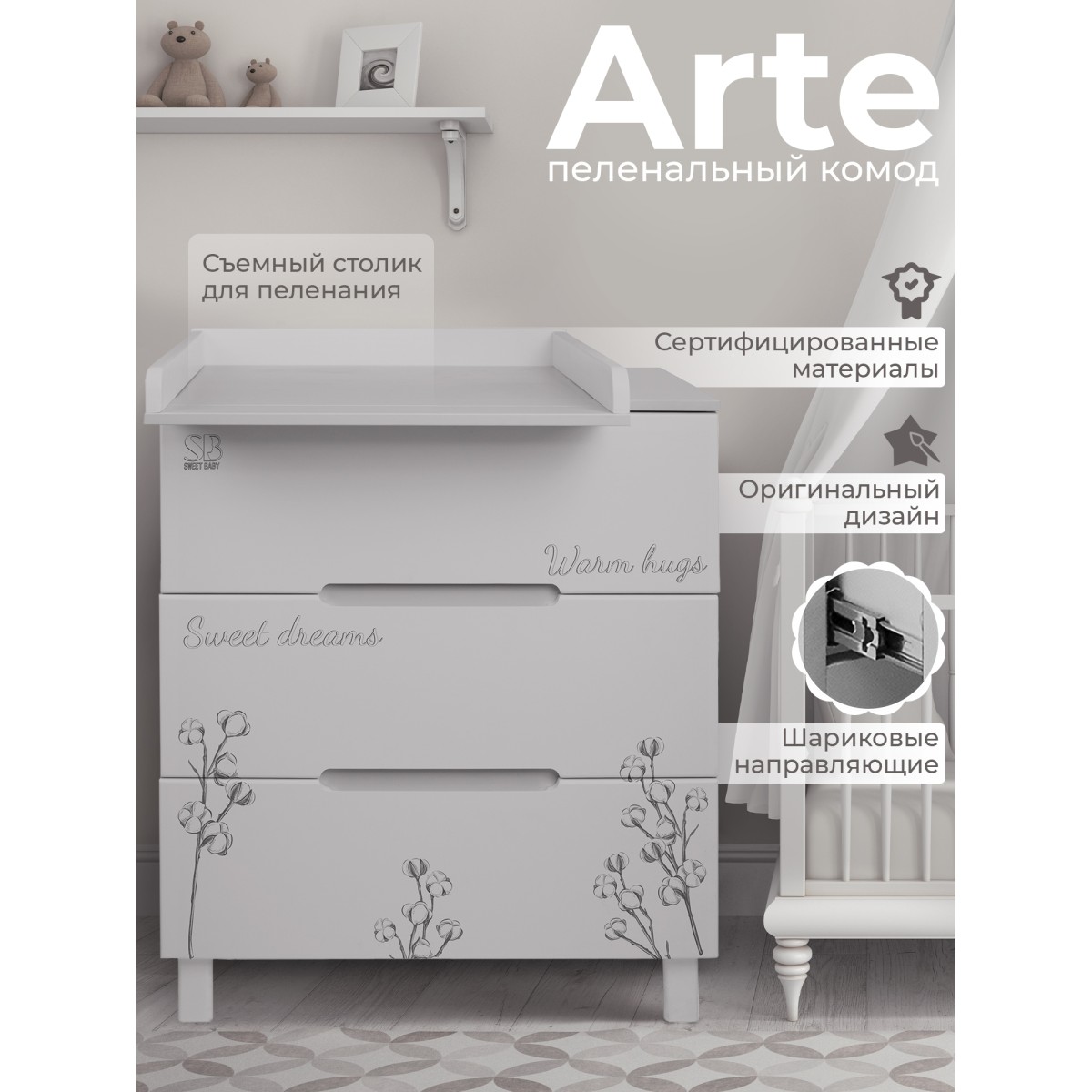 Благодаря лаконичному скандинавскому стилю комод Sweet Baby Arte выглядит очень современно и стильно. Рисунки придают комоду неповторимый дизайн.