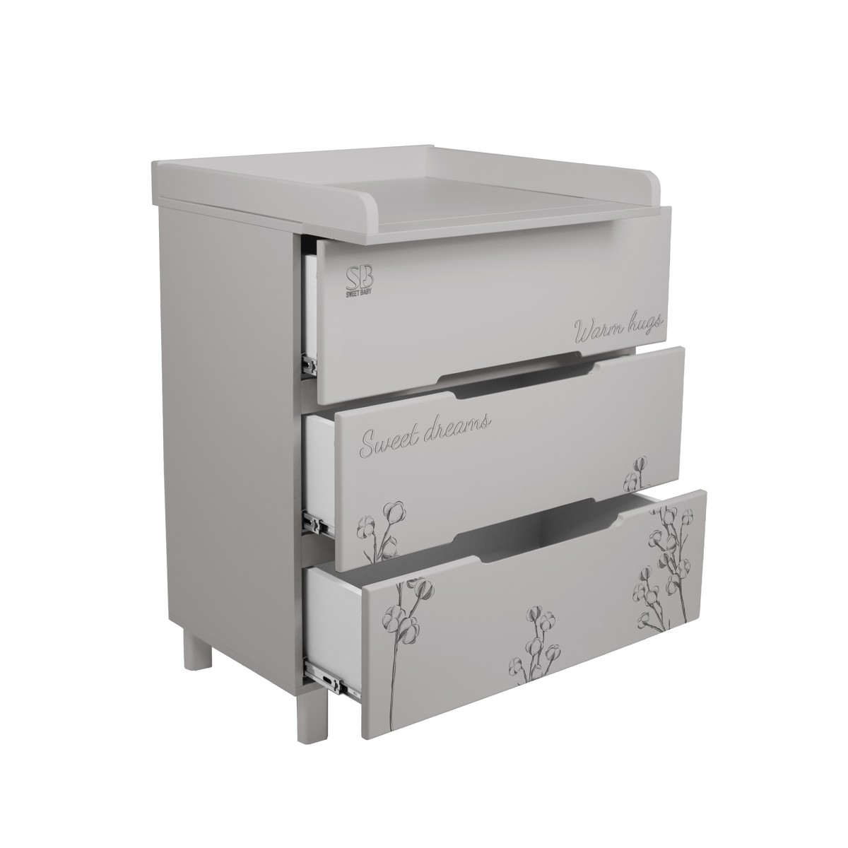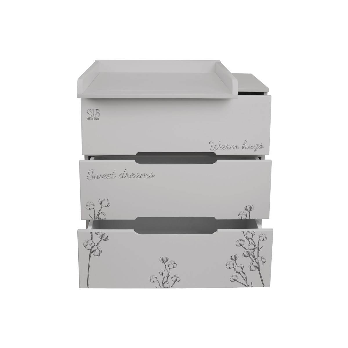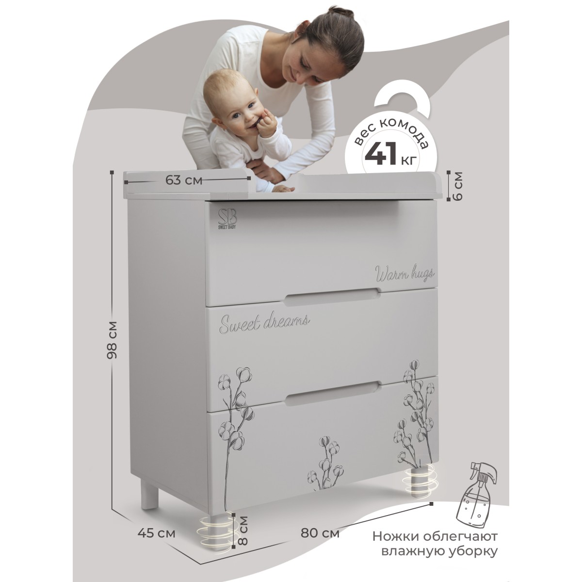 У комода есть съемный пеленальный столик, который делает процесс пеленания удобным и безопасным как для вас, так и для вашего новорожденного ребенка.