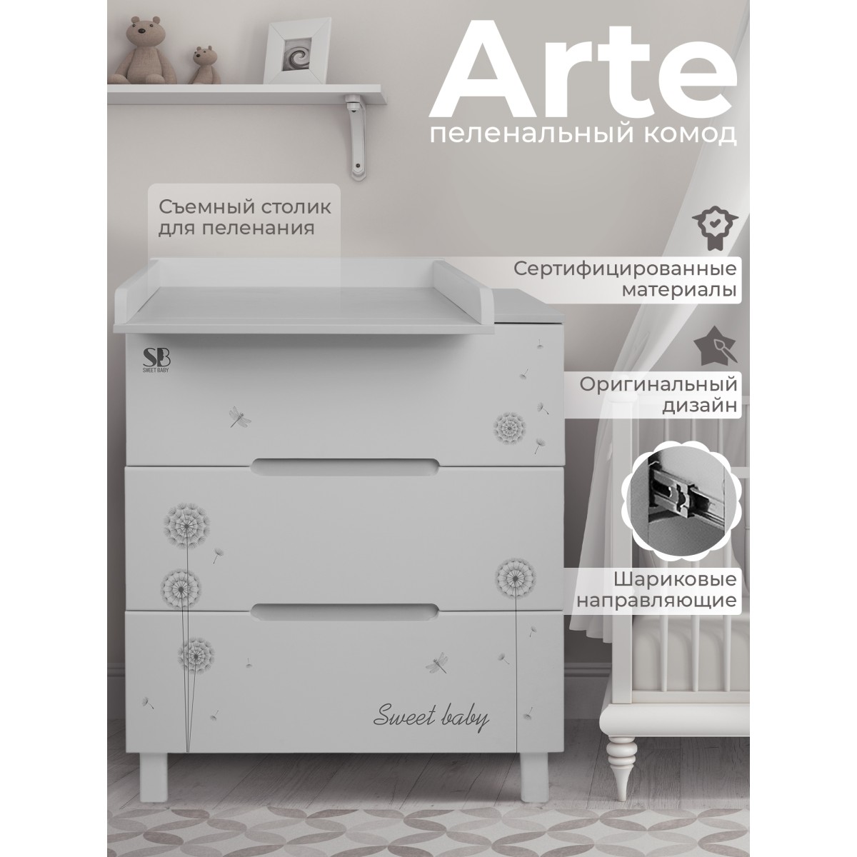 Благодаря лаконичному скандинавскому стилю комод Sweet Baby Arte выглядит очень современно и стильно. Рисунки придают комоду неповторимый дизайн.