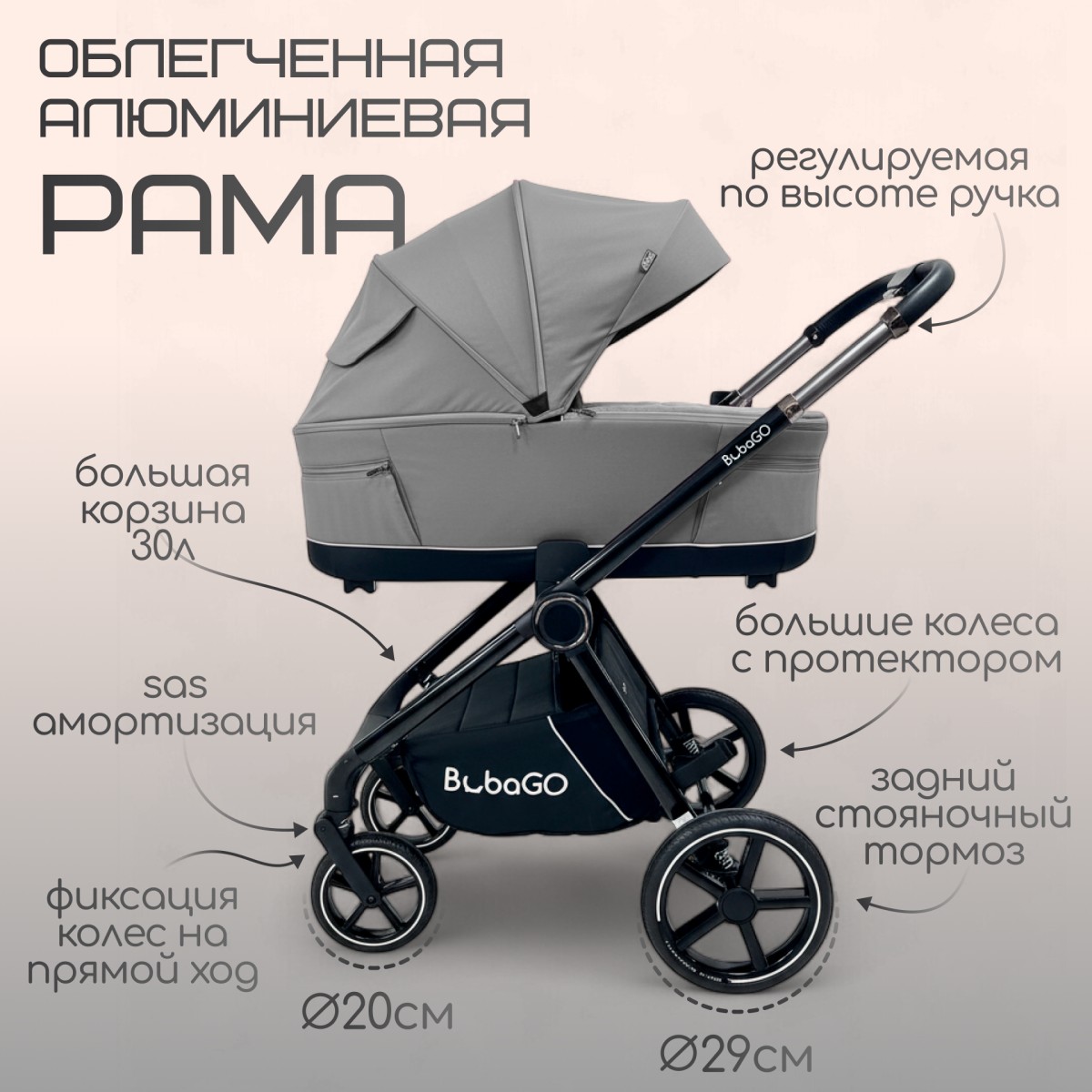 Завышенная постановка люльки на раму (61 см от земли) позволяет маме не напрягать спину наклоняясь к ней.