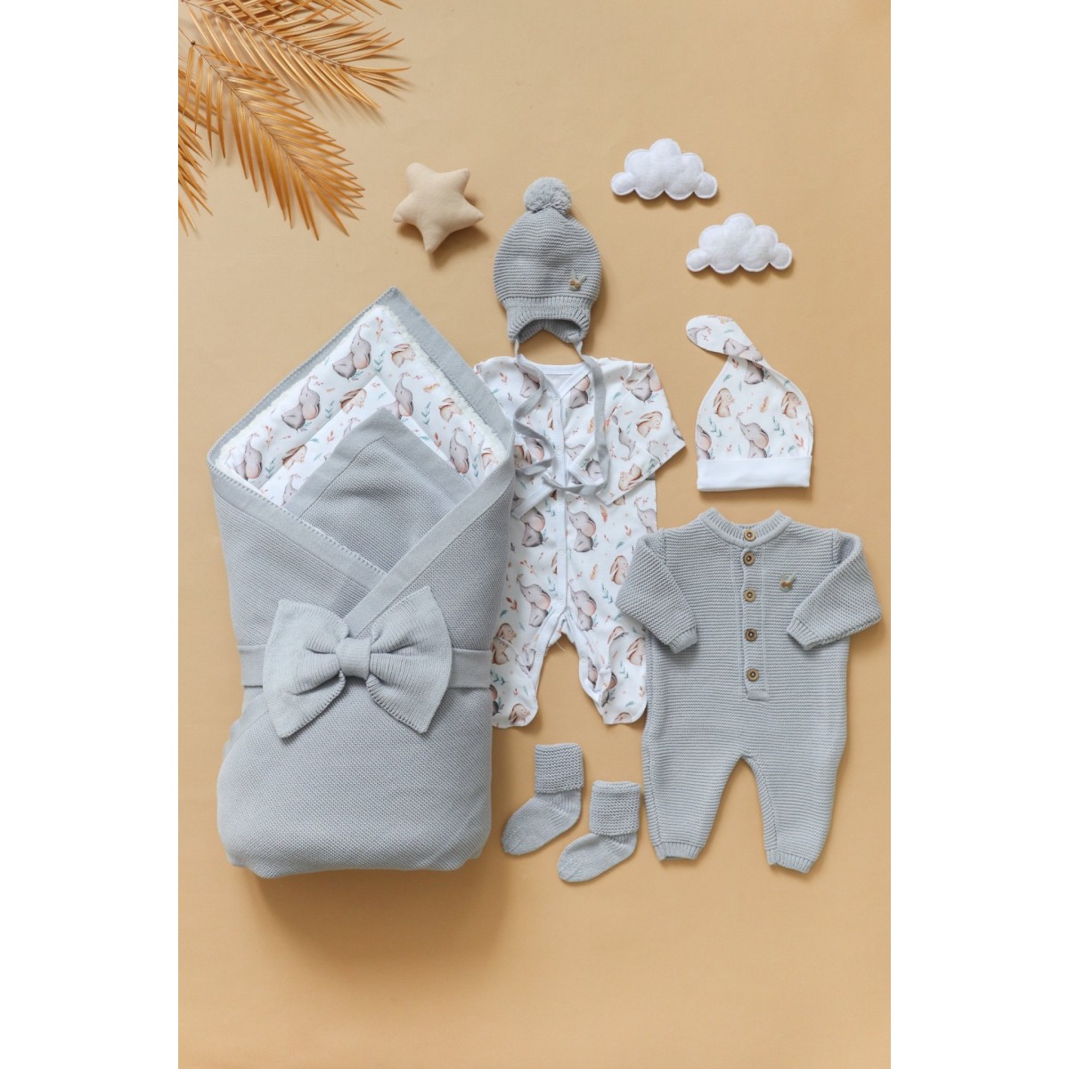 Комплект на выписку из роддома 8 предметов "ALPACA" цвет: серый /слоники и зайки 0363