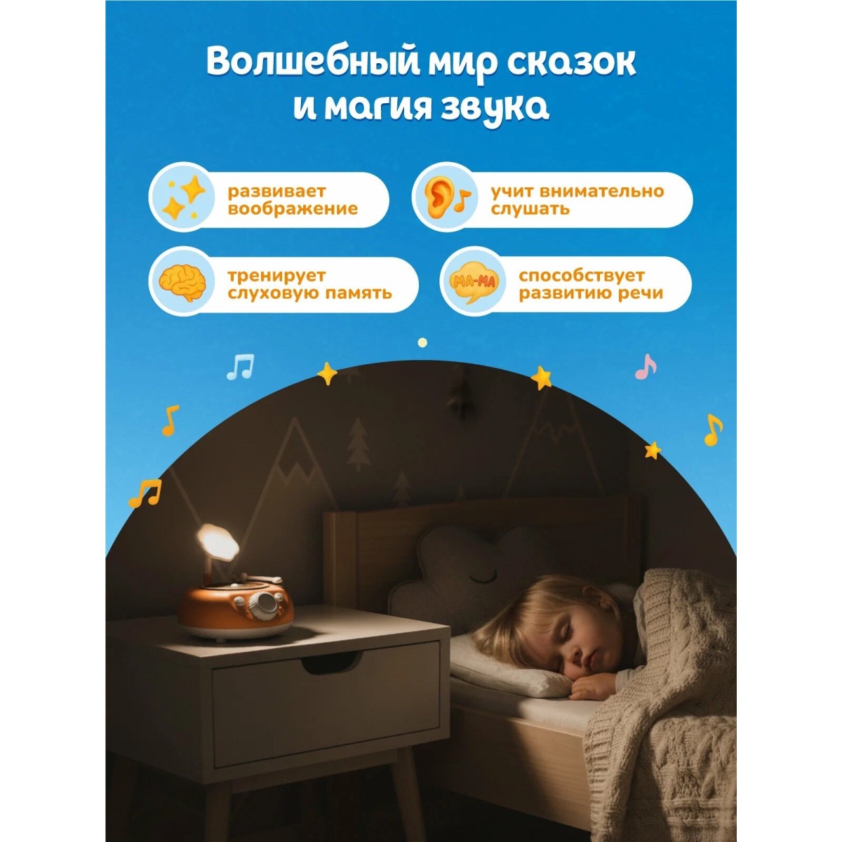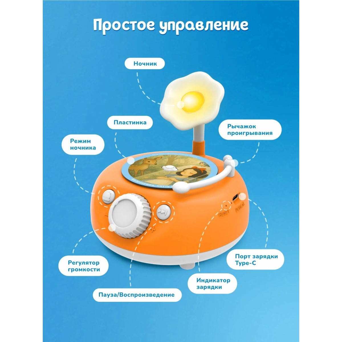 Уютная подсветка. Мягкий свет превращает граммофон в ночник для комфортного прослушивания сказок перед сном.
