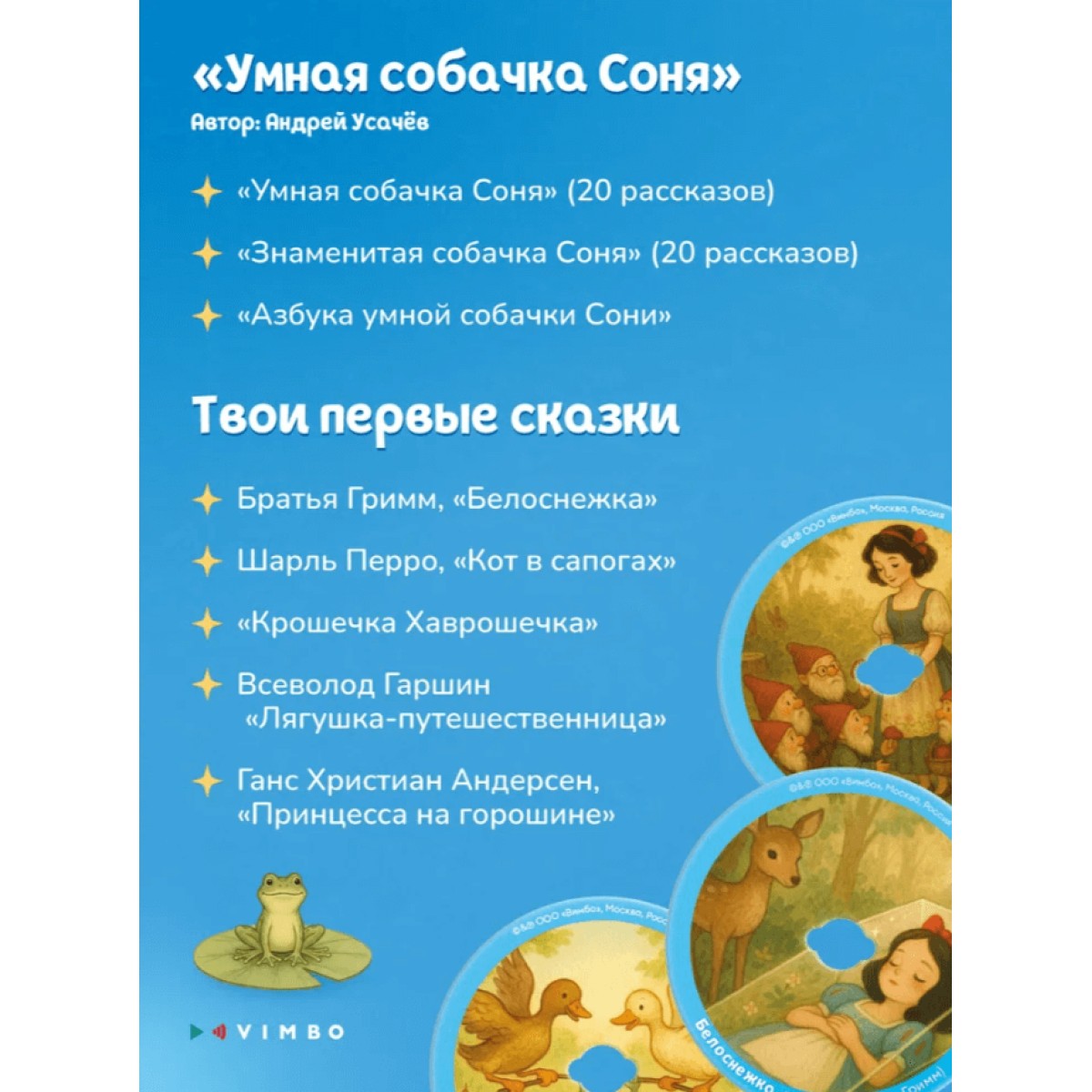 В граммофоне мы собрали самые популярные и любимые произведения: сказки Корнея Чуковского, русские народные сказки, истории про умную собачку Соню и многое другое. В комплекте 73 карточки – хватит на долгие часы увлечённого прослушивания. Мы тщательно подошли к выбору контента и включили в набор только лицензионные записи от аудио издательства «Вимбо».