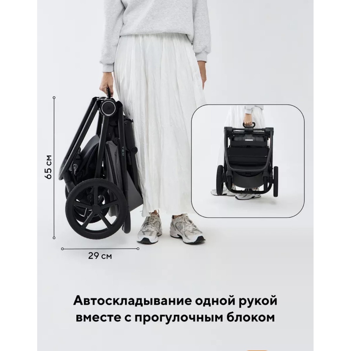 -коляска дополнена функцией автоскладывания - просто нажмите кнопку и слегка подтолкните подножку в обратную сторону. Модель складывается автоматически сразу вместе с блоком, независимо от его положения (по ходу/против хода).