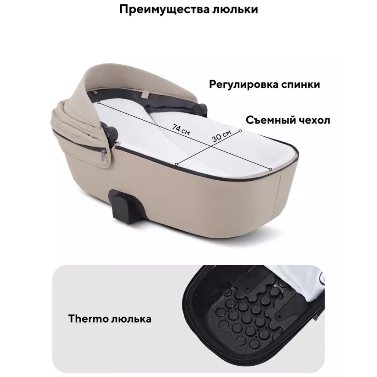 -термолюлька литая. Особый материал, из которого выполнен блок, идеально поддерживает микроклимат внутри: на улице жарко - в люльке прохладно, на улице холодно - в люльке тепло. В то же время высокотехнологичный материал люльки характеризуется небольшим весом и ударопрочностью.