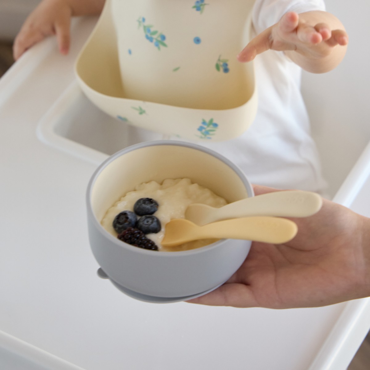 Набор силиконовых ложек с мягким черпачком и эргономичной ручкой с нейлоновым стержнем внутри для комфортного кормления.