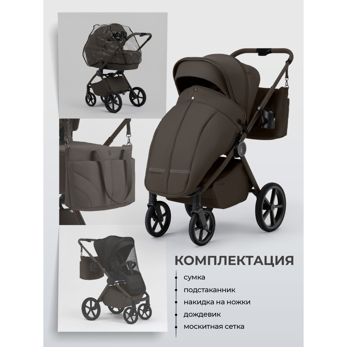 В комплект коляски Elegante Pro входят: дождевик, москитная сетка, стильная сумка с термокарманом, подстаканник, пеленальный матрасик