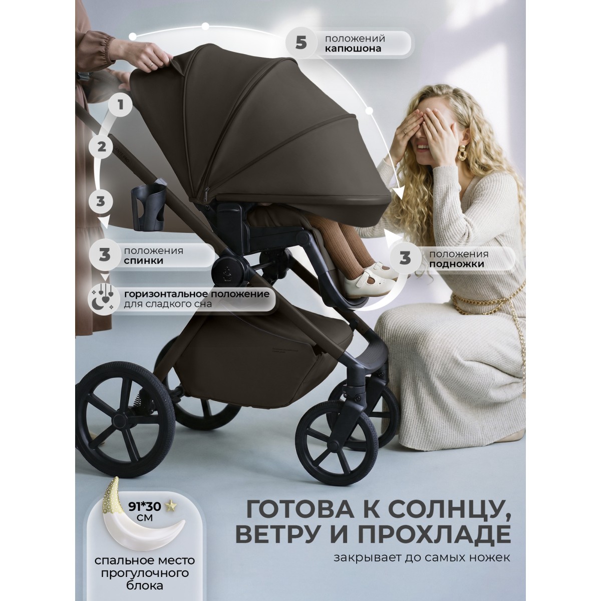 Большой капюшон с пропиткой от ультрафиолета UV50 регулируется в 5 положениях, благодаря 2 дополнительным секциям он полностью закрывает кроху от ветра, дождя и солнца до самых ножек.