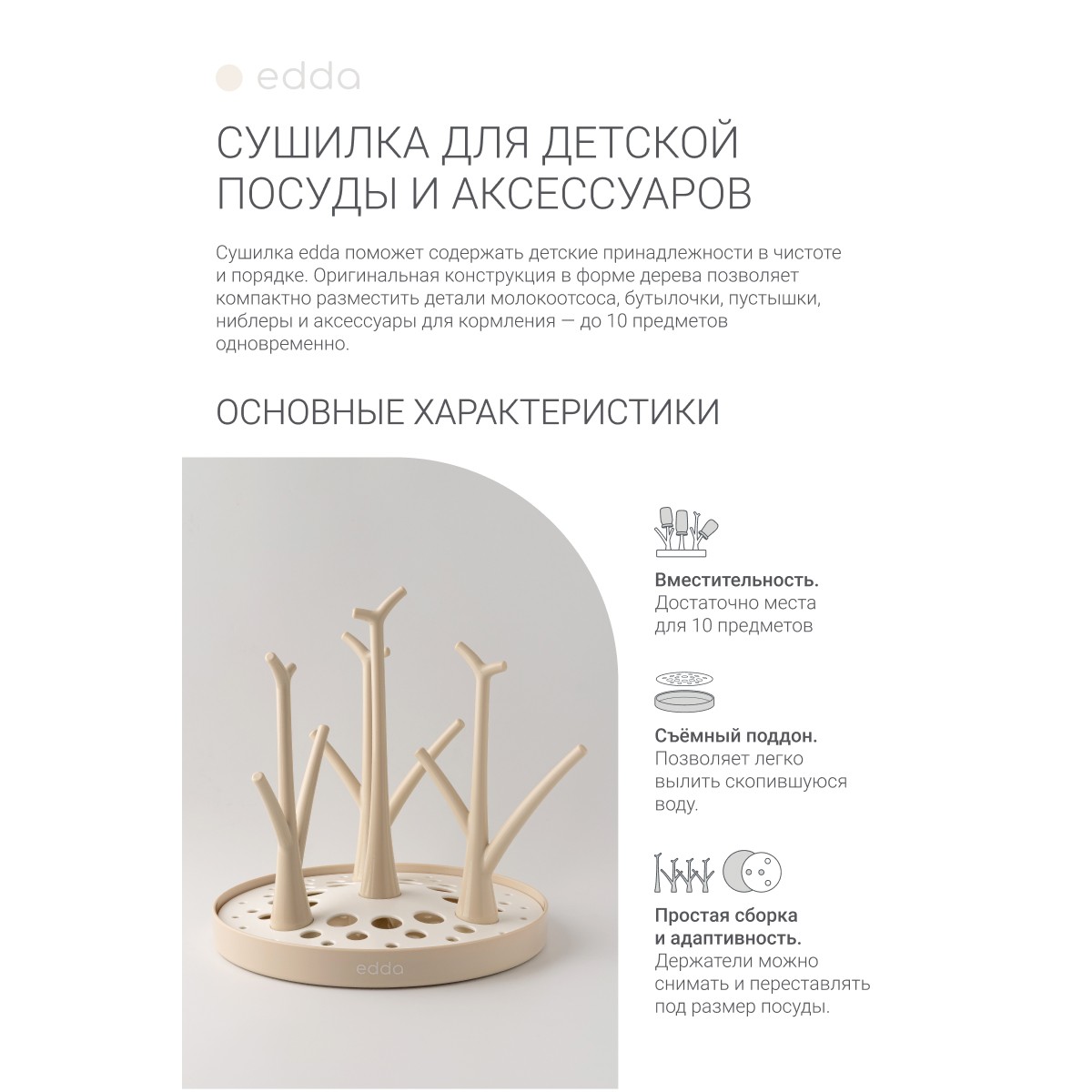 Сушилка edda поможет содержать детские принадлежности в чистоте и порядке. Она устойчива даже при полной загрузке благодаря продуманному распределению опоры и веса, а съёмный поддон позволяет легко вылить скопившуюся воду.