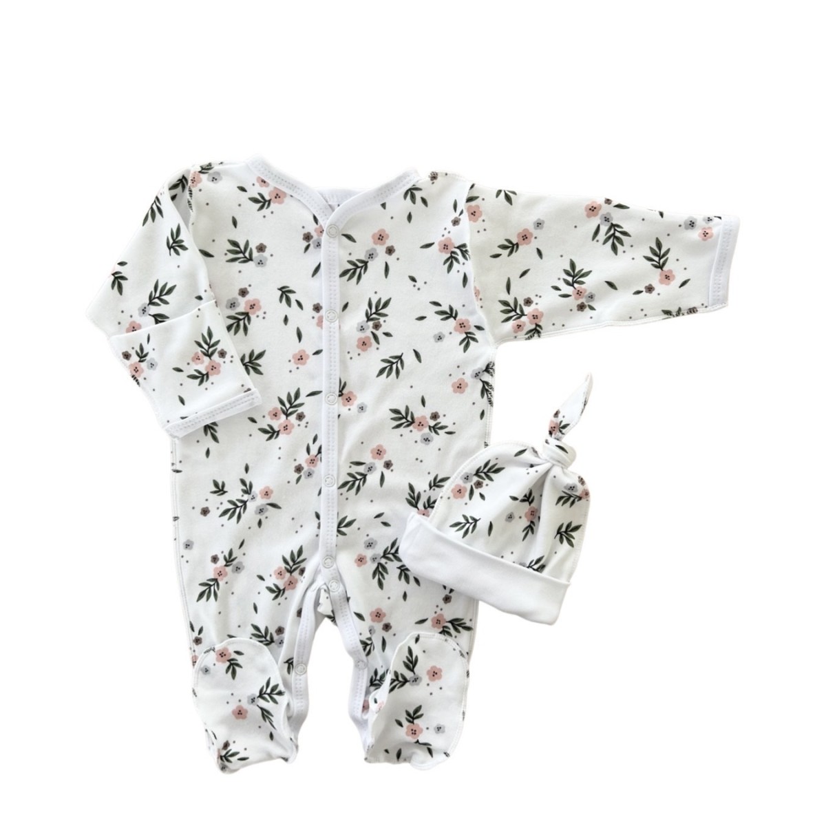 Комплект: Слип на кнопках + шапочка-узелок со швами наружу 50 см Newborn "Цветочки" Т-097