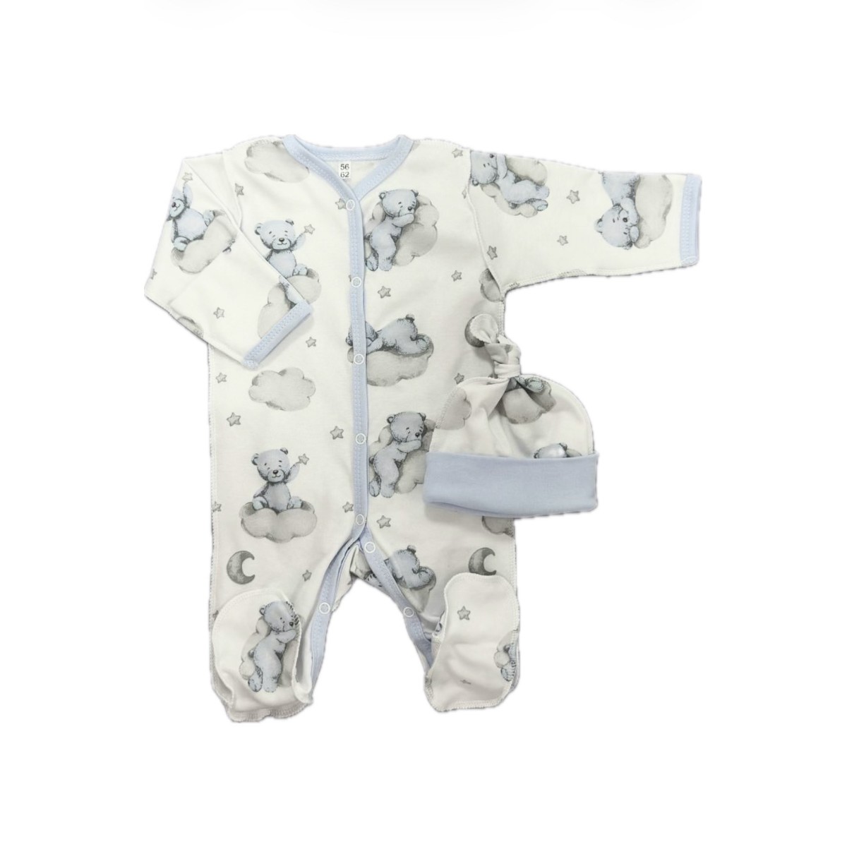 Комплект: Слип на кнопках + шапочка-узелок со швами наружу 56-62 см "Мишки на облаках " Т-097