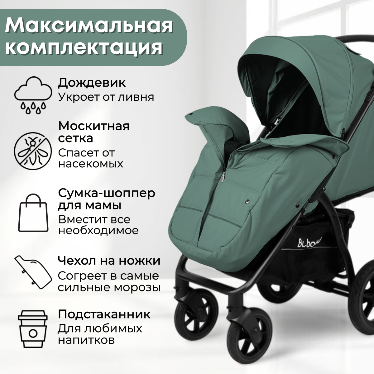 • В комплекте: дождевик, москитная сетка, теплый чехол на ножки, подстаканник, сумка-шоппер.