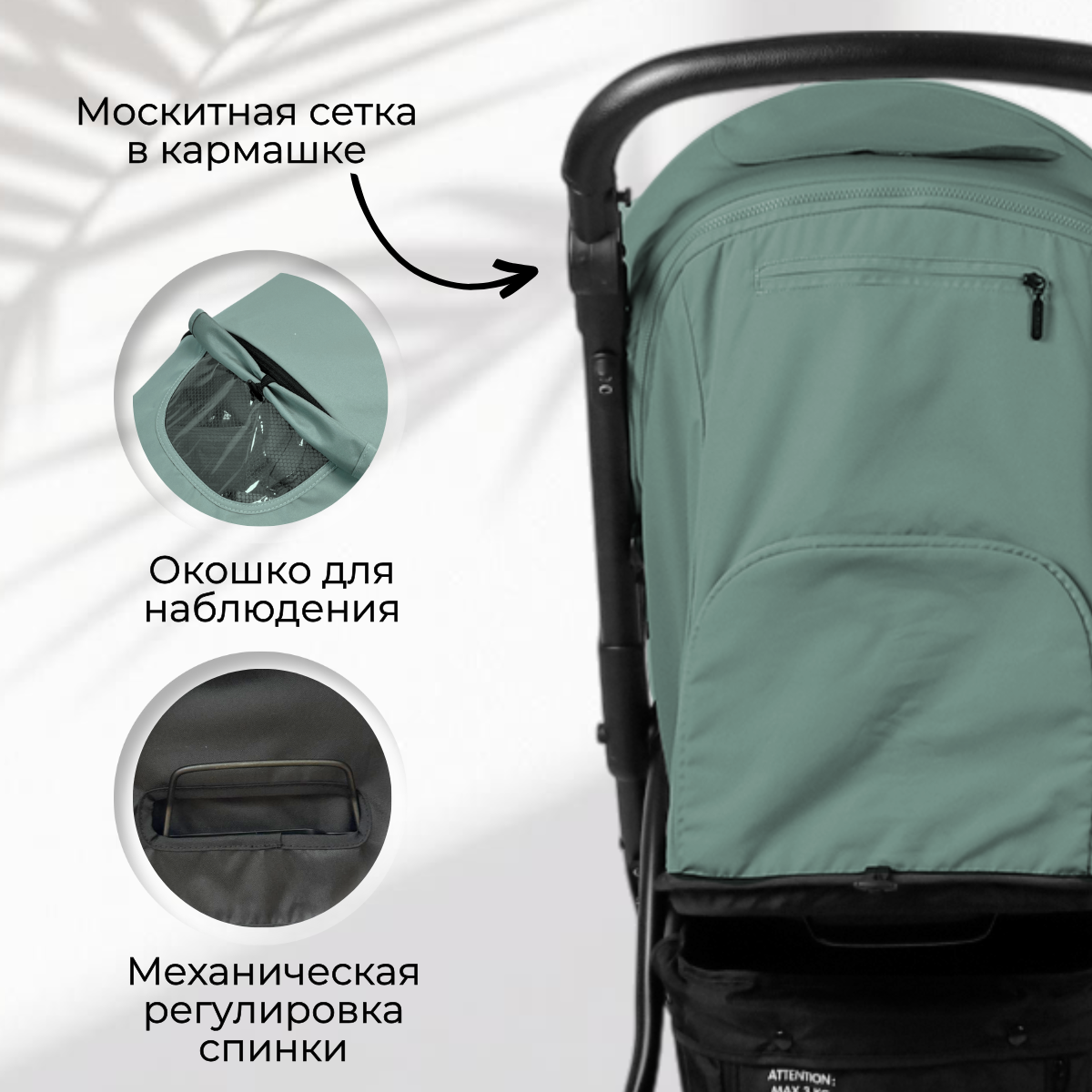 • Москитная сетка в окошке для проветривания на спинки защитит от насекомых, а смотровое окно на магните в капюшоне — для контроля за малышом.