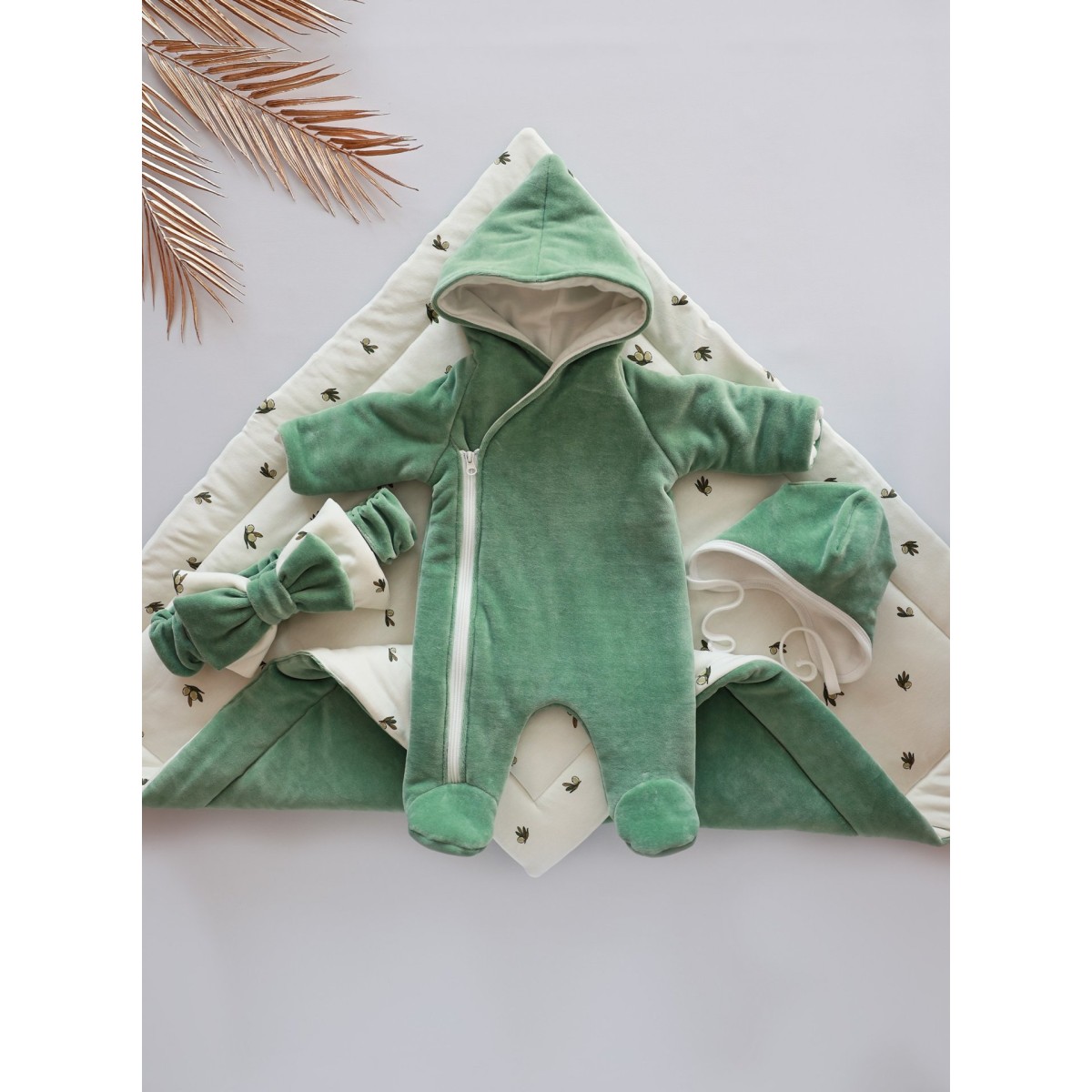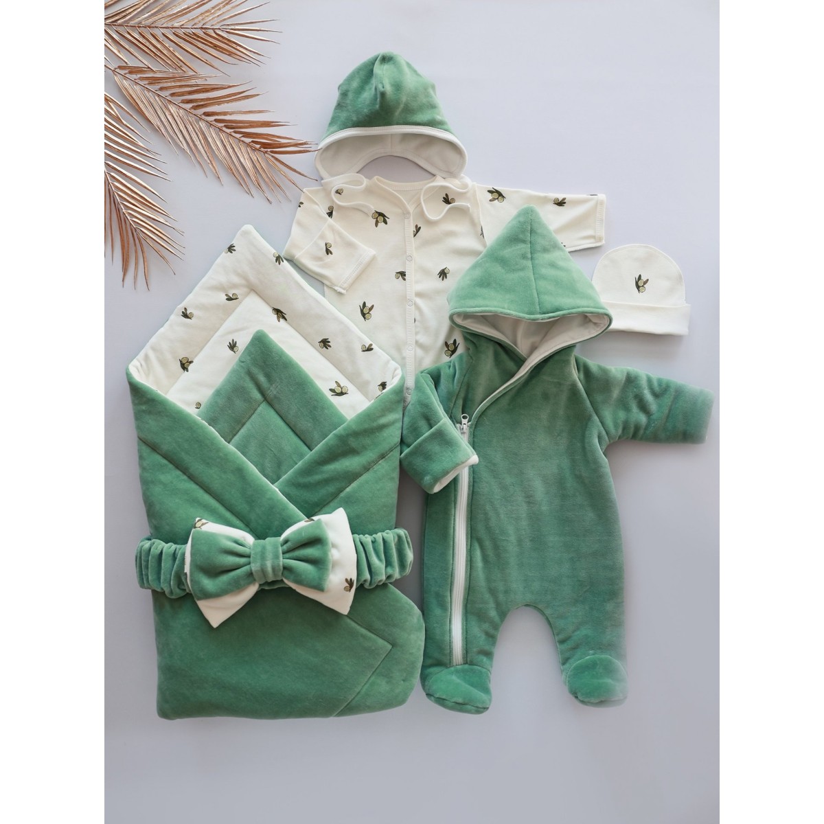 Комплект на выписку из роддома 6 предметов Bunnyphant цвет: оливковый + оливки 0321
