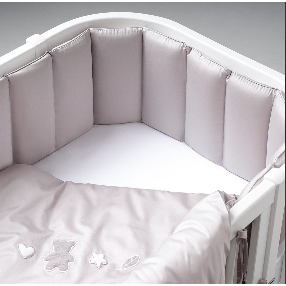 Специально к этому комплекту мы разработали бортики со съемными чехлами на молнии из двух частей: первая состоит из 6-ти подушечек, вторая - из 12-ти. Сочетание натурального хлопкового сатина и воздушного гипоаллергенного наполнителя Холлкон обеспечивает еще одно полезное свойство: подушечки хорошо пропускают воздух и поддерживают температурный баланс.