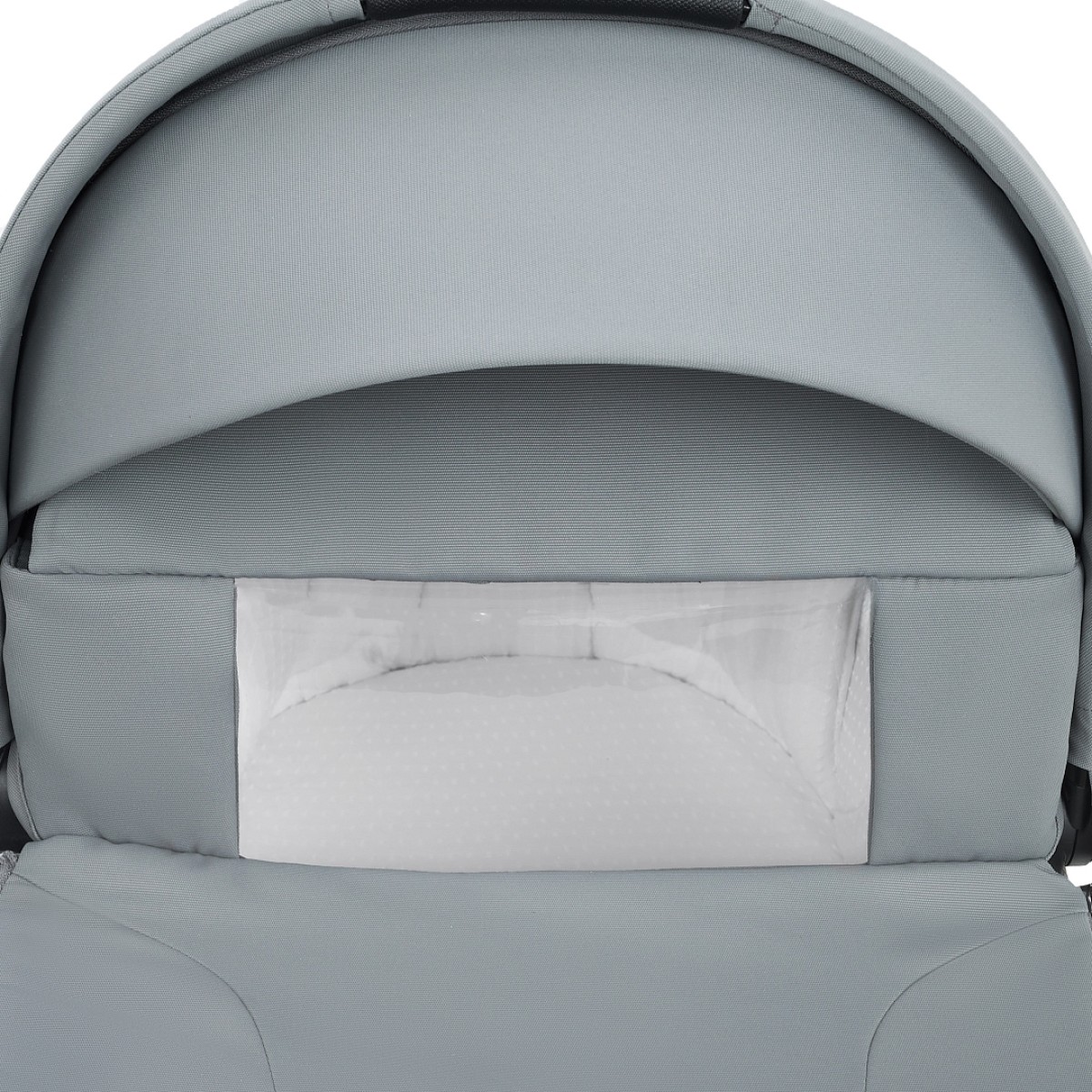 Капор люльки оборудован ручкой для переноски, имеется съемный козырек, дополнительная секция, климатическое окно под молнией в корпусе люльки и в капюшоне.