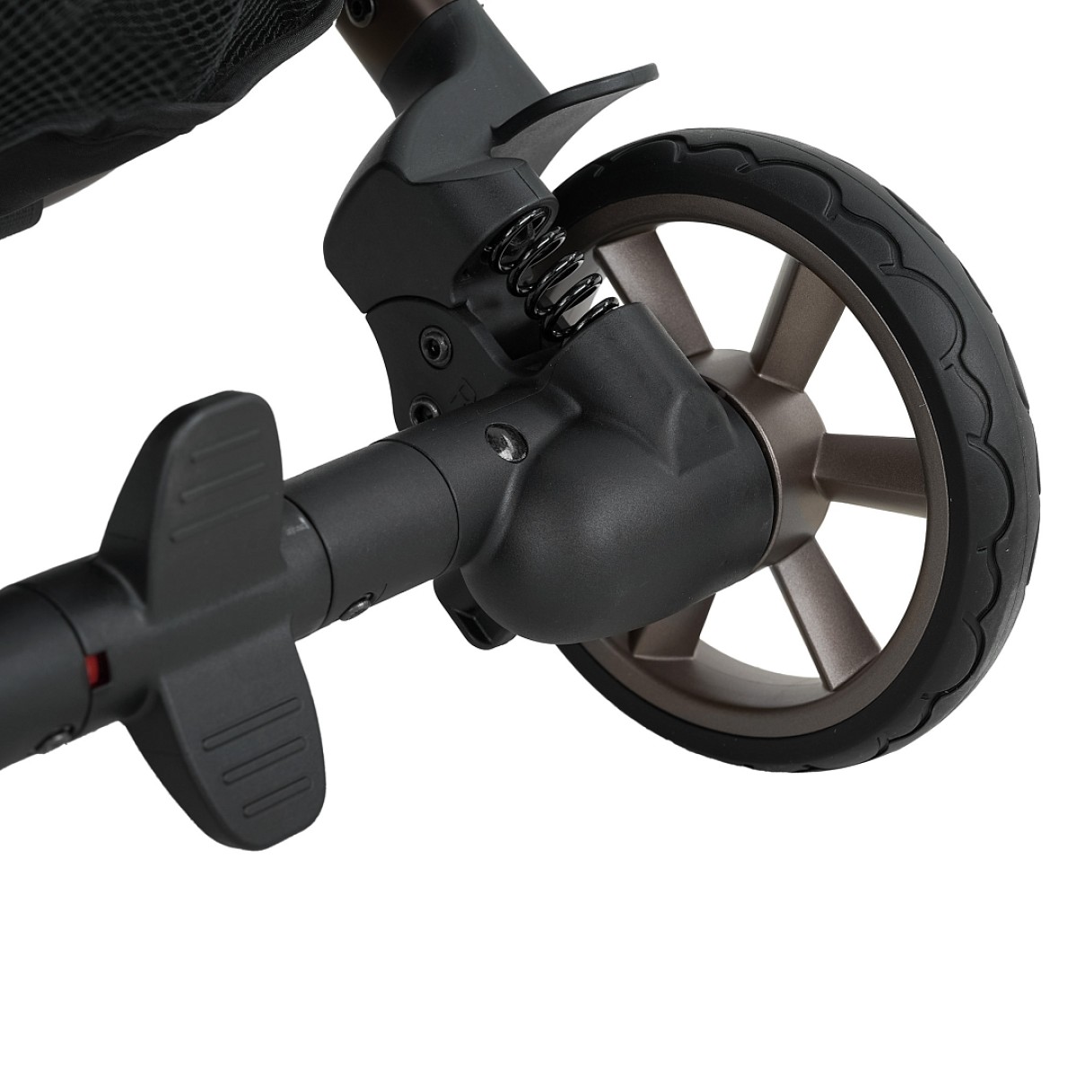 • Отличная маневренность и плавность хода. Шасси имеет мягкую подвеску и шариковые подшипники на каждом колесе. Задние колеса диаметром 15 см. Передние колеса диаметром 13см с амортизацией и функцией блокировки.