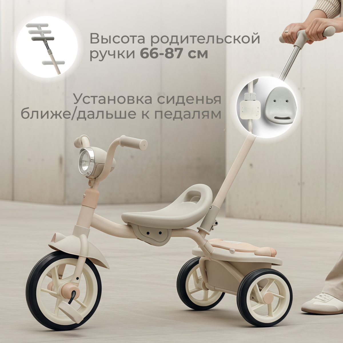 В комплект входит съёмная родительская ручка с регулировкой по высоте (66–87 см). Она помогает поддерживать ребёнка на первых этапах обучения, а когда малыш станет увереннее — ручку можно полностью снять.