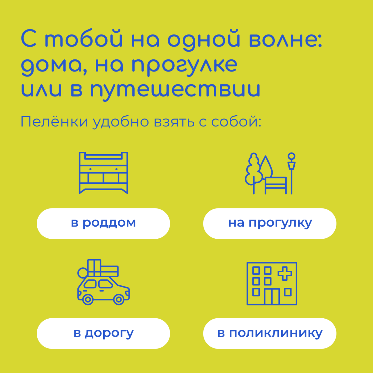 Компактный формат упаковки не занимает много места и легко помещается в сумку. Пеленки можно брать с собой в роддом, поликлинику, на прогулку и в поездку.