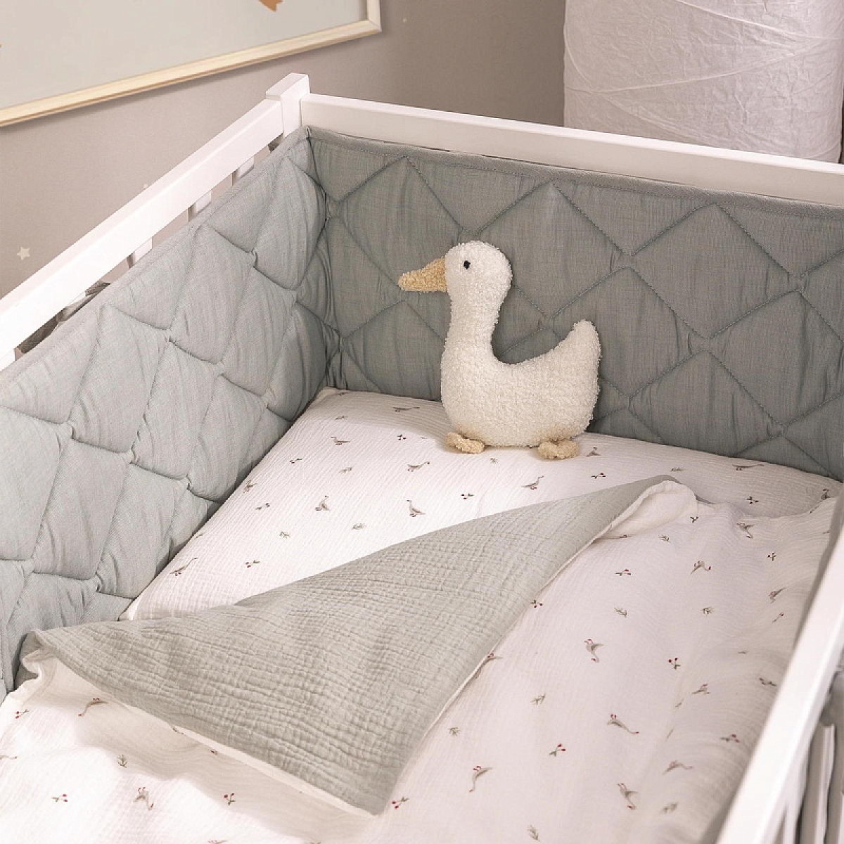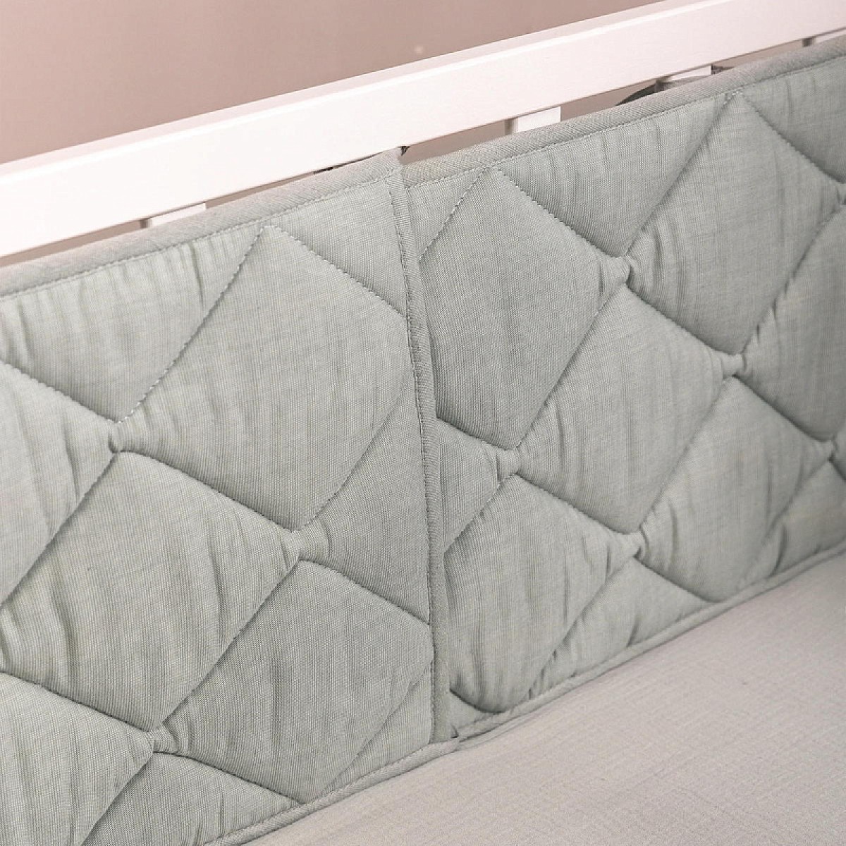 Стеганая структура делает бортики плотными и упругими, но при этом гибкими, чтобы легко принять нужную форму по периметру кроватки. Они хорошо защищают малыша от сквозняков, застреваний, случайных ударов и создают уютную атмосферу для спокойного сна.