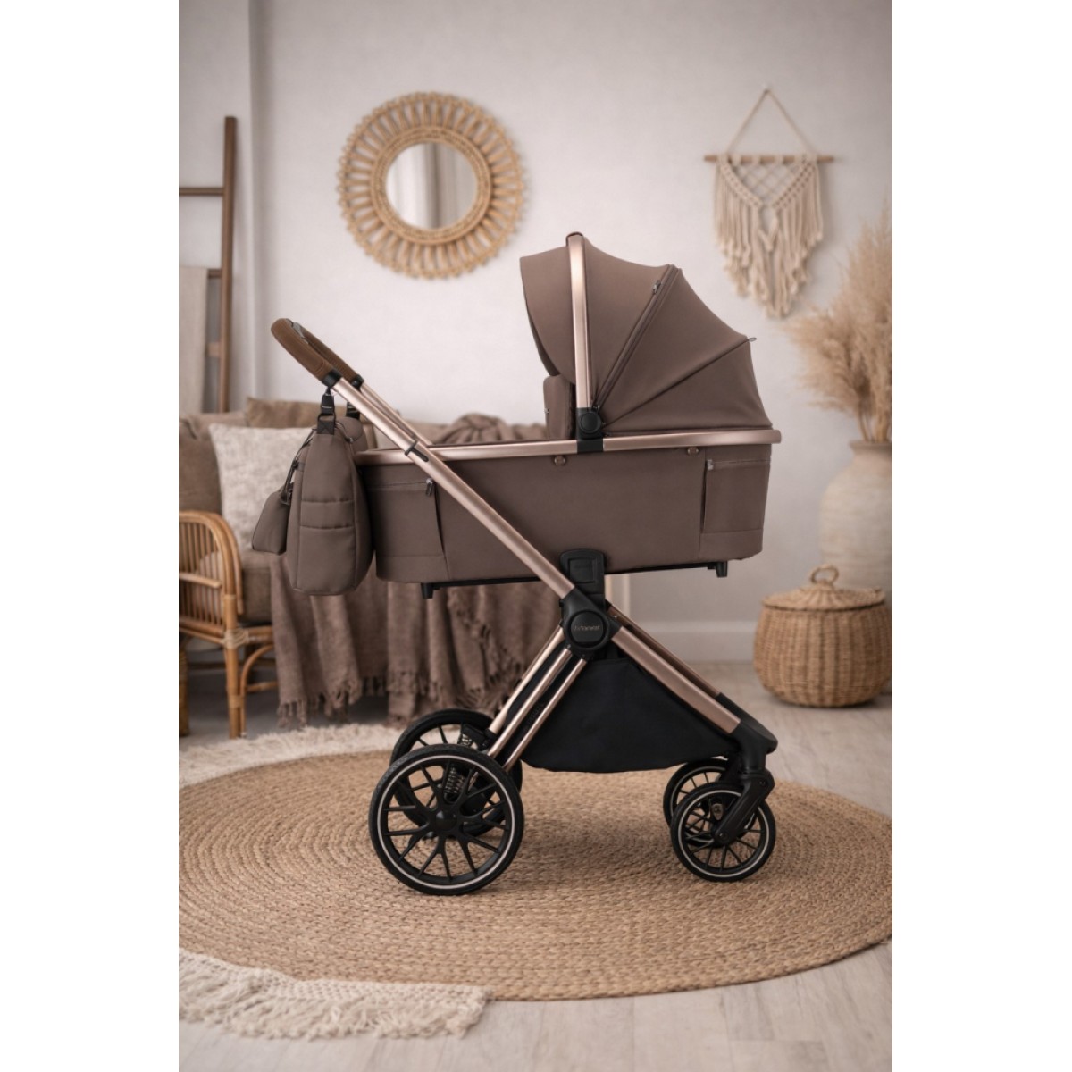 В комплекте идут вместительная сумка с удобной магнитной застежкой, сумка для мелочей, корзина для покупок, дополнительный мягкий матрас, универсальная москитная сетка, дождевик, шторка от солнца, стандартные и дополнительные адаптеры.