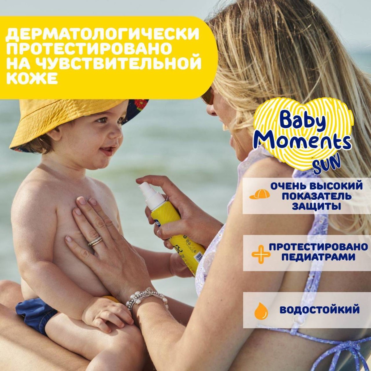Формула солнцезащитного спрея Baby Moments SUN не содержит оксибензона и октиноксата, которые негативно воздействуют на морскую экосистему и часто встречаются в солнцезащитных средствах, а также ароматизаторов и спирта.