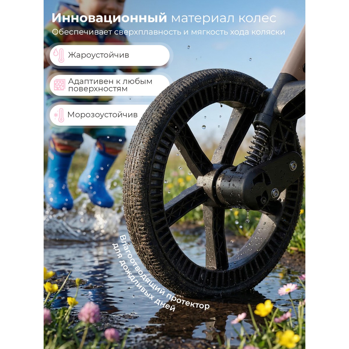 Водоотталкивающая ткань капора защищает от ультрафиолетовых лучей и непогоды, а накидка на ножки - распашонка с легким доступом к ребенку – от ветра и холода;