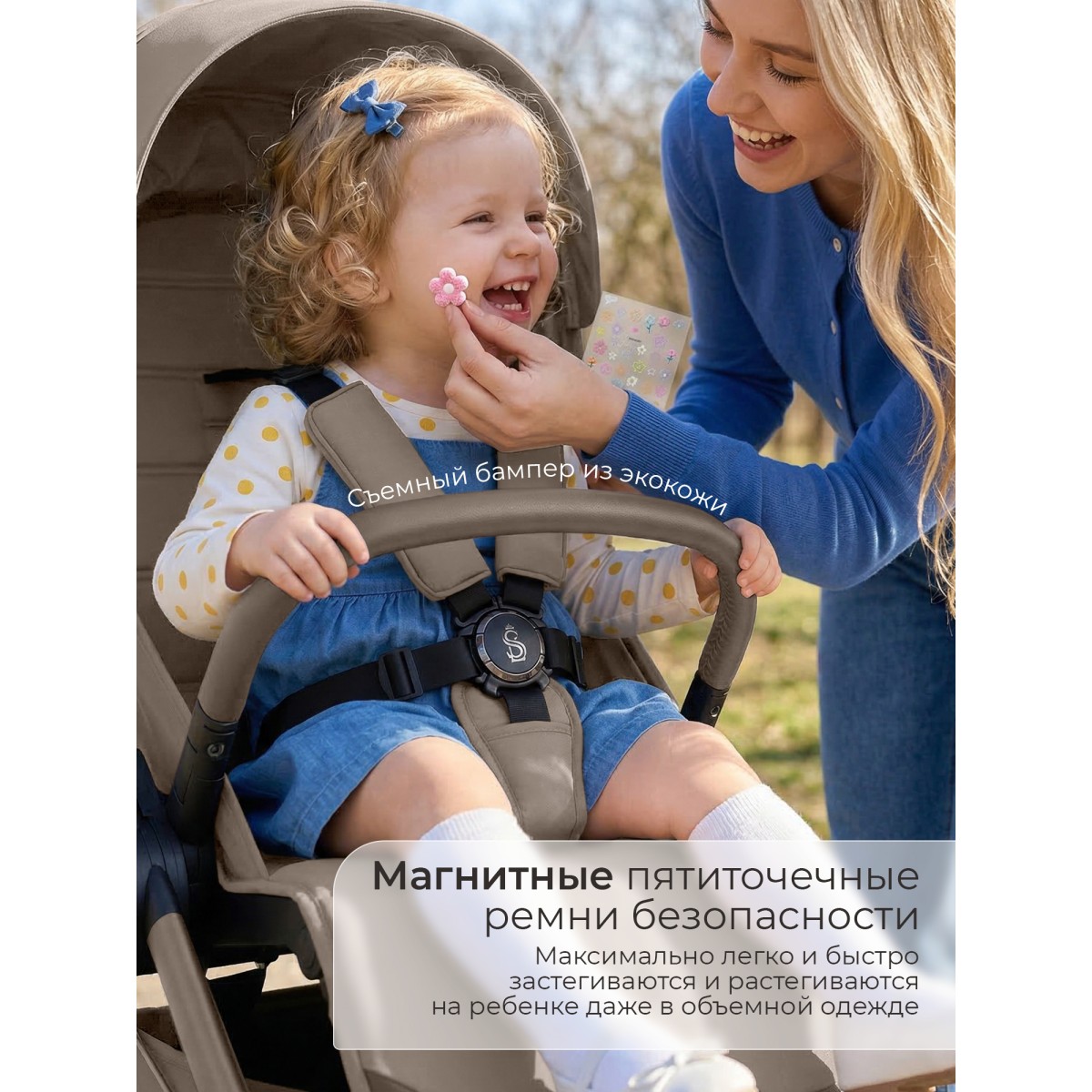 Пятиточечные магнитные ремни с мягкими накладками и съемный поворотный бампер для быстрой и легкой посадки;