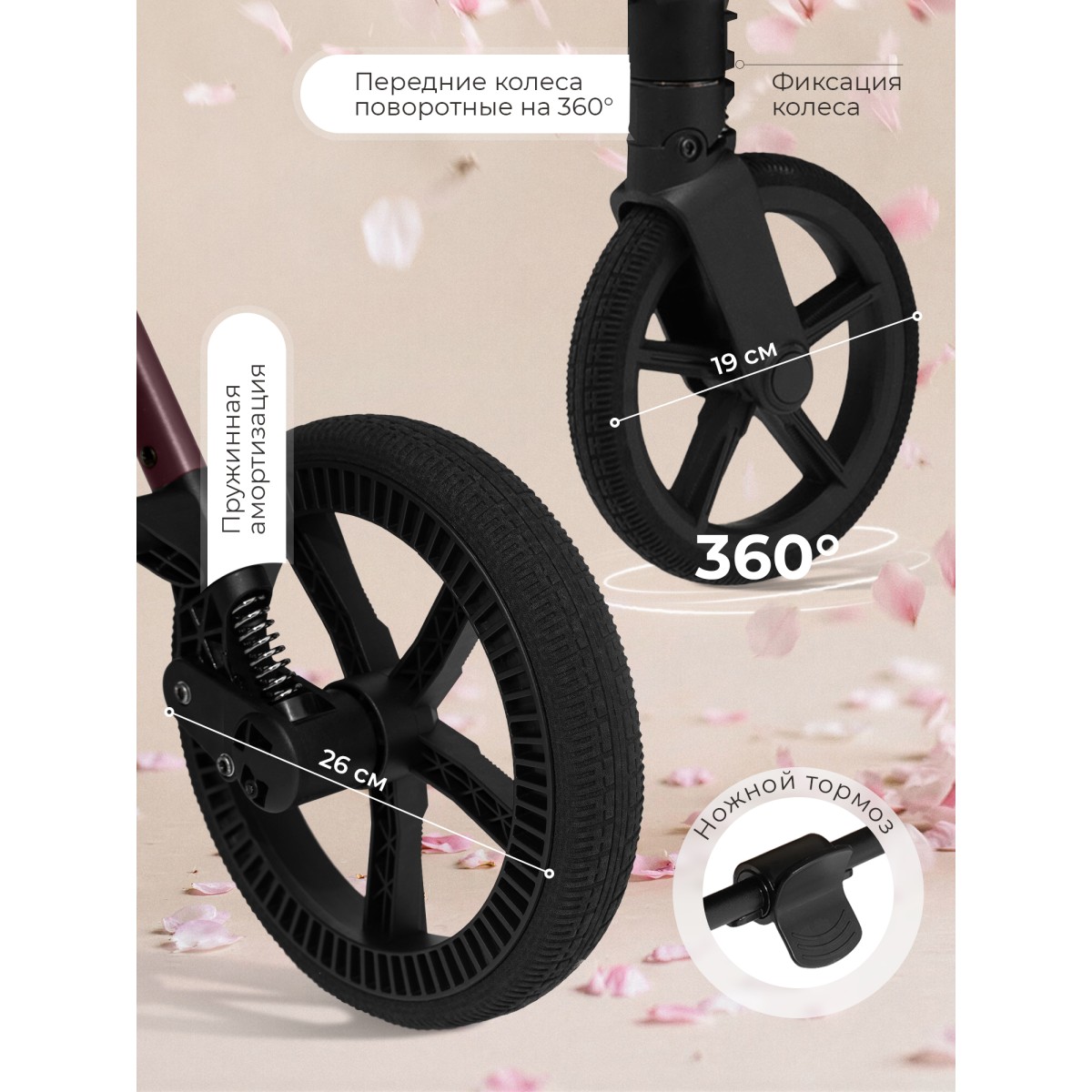 Детская коляска SBL Elegante D обладает маневренностью, плавностью хода и отличной проходимостью. Все благодаря большим задним колёсам (26 см), передним поворотным колесам с фиксацией (19 см) из инновационного материала- высокомолекулярного полимера, а также пружинной амортизации на все 4 колесах;